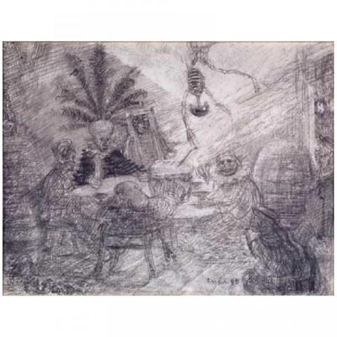 Tegen valavond was het in het appartement, gelegen tussen de Gallerie dell’Accademia en het Peggy Guggenheim museum, een komen en gaan van de meest kleurrijke figuren. Vrienden en kennissen kwamen zich voor de aanvang van het carnavalsbal in hun prachtige, historische kostuums aan Ysbrant tonen, zodat ze zich verzekerd van de zegen van de meester naar het feest konden begeven. Een jongen verkleed als page schonk hem een gouden broche die nog aan zijn overgrootvader, een Venetiaanse graaf, had toebehoord. C. begon zich tussen de menigte van gemaskerde mensen wat ongemakkelijk te voelen. Hij wilde zo snel mogelijk van de tekening af, maar de afspraak met de kunsthandelaar was reeds twee keer uitgesteld. Ysbrant had hem een Lavallière in fuschia rosé rond de hals had geknoopt en zo was hij als enige gast, in een fluwelen broek en een wit hemd met kanten mouwen en lakschoenen met zilveren gespen als een schandknaap, ongemaskerd de piano nobile binnengestapt. Hij had het talrijke gezelschap begroet en toen hij eindelijk neerzat en van zijn glas champagne wilde nippen, was hij zonder enige aanleiding van zijn stoel gevallen. Het kristallen glas spatte in scherven uiteen. Ontzet keek hij naar de gasten, krabbelde snel recht en ging weer op de stoel zitten waar hij zonet in het bijzijn van iedereen, zonder dat iemand hem had aangeraakt, was afgegleden. Hij kon de gedachten achter de maskers niet raden, niemand zei iets maar iedereen had het gezien; de tekening van Ensor lag op de grond. Het moest een kwade geest geweest zijn die de stoel onder hem vandaan had geschopt. O hij die geen masker nodig dacht te hebben was ontmaskerd. Welke kerker bewoonde de geest die hem van zijn stoel had getrapt? Ysbrant liep op hem af en vroeg bezorgd of hij zich niet bezeerd had en nadat hij hem verzekerd had dat er niets ernstig gebeurd was werden de feestelijkheden verder gezet. C. stak de tekening in zijn binnenzak, dronk voorzichtig zijn nieuw glas leeg, en verliet nadat hij zich van zijn plichtplegingen tegenover de gastheer en gastvrouw had vergewist, ongemerkt het bal.