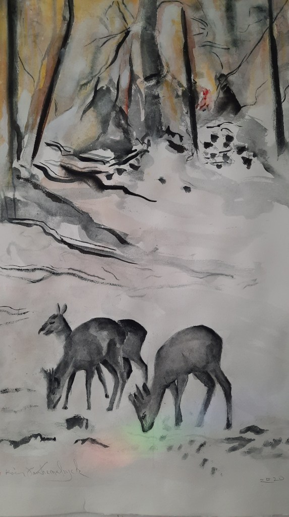 De voettocht en de filosofische overpeinzingen van Tesson brachten mij de rust die ik broodnodig had en boden een uitzicht op de natuur die ons nog restte. Ik voelde een dringende noodzaak om naar ‘het primordiale’ terug te keren. Wat dat ook mocht betekenen wist ik nog niet, maar sinds we in maart 2020 (toen het wanhopig gefladder van een in stukken gereten vleermuis uit Wuhan de val van de mens in gang zette en wereldwijd een pandemie veroorzaakte) met zijn allen van Het dak van de wereld getuimeld waren, wist ik dat er iets moest veranderen. Wat ooit moest gebeuren was gebeurd. Het was tijd om na deze globale smak op onze schreden naar de basis terug te keren.