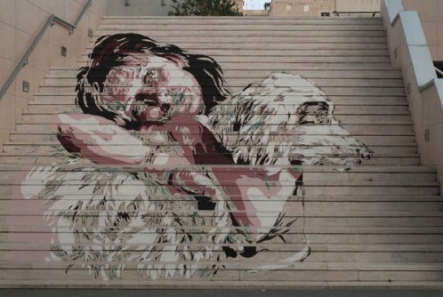 Op de trappen van de Nuovo Mercato Trionfale (aan de Via Andrea Doria, in de wijk Prati) vereeuwigt Diavù de filmdiva Anna Magnani, bekend van Mamma Roma. Beide portretten van Anna Magnani, voluit lachend met een kat in haar armen en dromerig een hond omhelzend, komen je van op de trappen, in een sfeer van onschuld en speelsheid, met een bijna tastbare tederheid tegemoet. (In een voorafgaande, denkbeeldige scène, verbeeld ik me het elegante getrippel van dierenpootjes die de brede, beregende Romeinse trap afdalen net voor Magnani ze optilt en in haar armen sluit. Diavù schildert zijn personages met dezelfde poëtische, sensualiteit, die ook bij de personages in Pasolini’s films terug te vinden is.